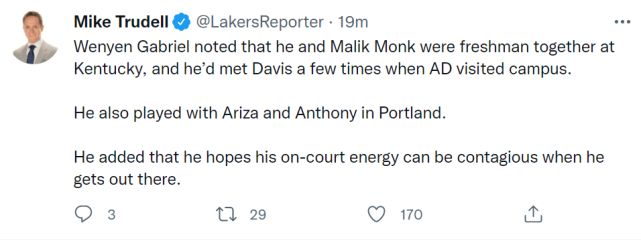 加布里埃尔合作过的前队友就更多了。他和蒙克在大一时共同效力于肯塔基大学,浓眉还在回到母校时和他见过几次面。他还和阿里扎、安东尼在开拓者当过队友。加布里埃尔希望自己在场上的能量能帮助到湖人。“我能在这儿打上球,我能提供帮助,他们需要一些能量和篮板!”加布里埃尔说道。他在得知签约湖人消息时,正在机场托运行李,准备去参加一场G联赛的比赛。