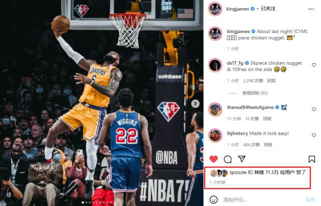 詹姆斯今日也更新社媒,晒出了自己得到56分一战的照片:“关于昨晚!56块炸鸡”仅仅一个小时,点赞量就突破70万了。
