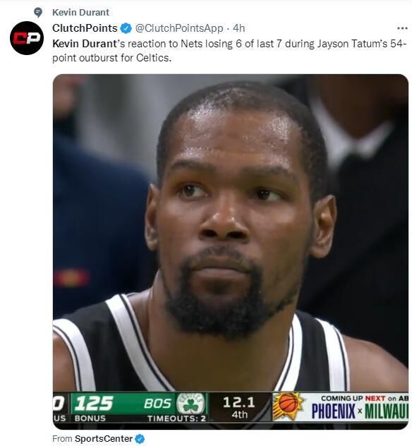 当杜兰特看着塔图姆拿下54分罚球锁定胜局时他一直在摇头,因为他知道球队越来越难,别说夺冠了就是季后赛都危险了。