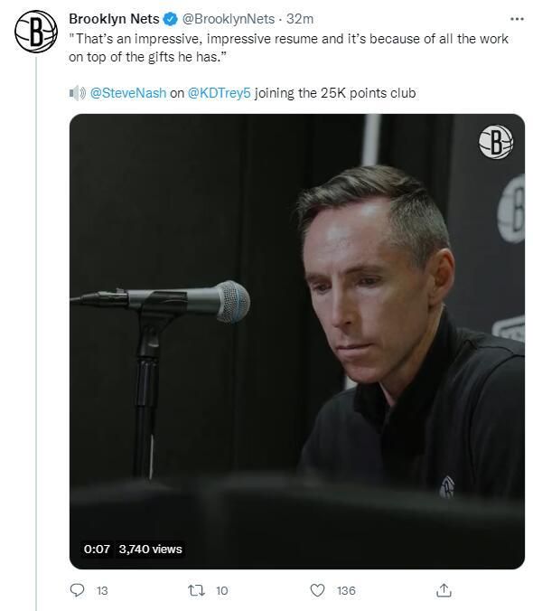 纳什只好用称赞杜兰特来转移视线,他表示:凯文-杜兰特是无与伦比的,我可以坐在这里谈论杜兰特一个小时,他的能力,他为球队牺牲的态度,对比赛的热情都是肉眼可见的。