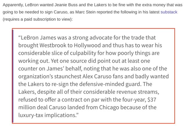 最后需要谈及的是,据美媒马克-斯坦因的说法,詹姆斯在去年休赛期曾非常希望湖人能与亚历克斯-卡鲁索完成续约合同: