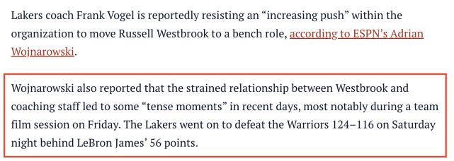 本赛季至今,拥有三巨头阵容的湖人并没有打出预料之内的战绩表现,而据ESPN记者阿德里安-沃纳罗斯基的说法,湖人主教练弗兰克-沃格尔正在“对抗”球队内部将拉塞尔-威斯布鲁克下放到替补席的压力。
