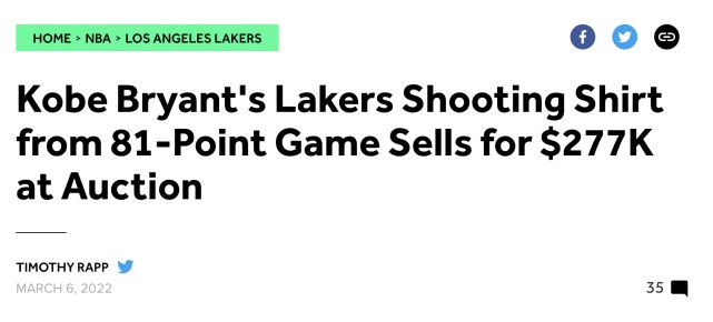 另一方面,据美媒报道,湖人传奇名宿科比-布莱恩特在2006年对阵猛龙的比赛中砍下81分前所穿的投篮训练服以277200美元的价值被拍卖: