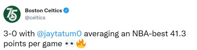 上周,凯尔特人获得3胜0负的战绩,塔图姆场均贡献41.3分6.3篮板5助攻。绿军官方晒图祝贺塔图姆当选东部周最佳。