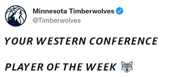 上周,森林狼获得4胜0负的战绩,唐斯场均贡献28分9篮板3助攻。森林狼官方晒图祝贺唐斯当选西部周最佳。