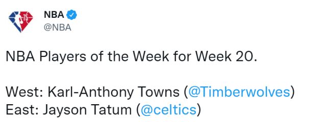 北京时间3月8日,NBA官方公布了第20周的东西部周最佳球员。凯尔特人的塔图姆当选东部周最佳球员,这是他本赛季第二次当选周最佳,生涯第六次获此殊荣。森林狼的唐斯当选西部周最佳球员,和塔图姆一样,这也是他本赛季第二次当选周最佳,生涯第六次获此殊荣。单场轰下56分的詹姆斯和近况出色的莫兰特均获得周最佳的提名。