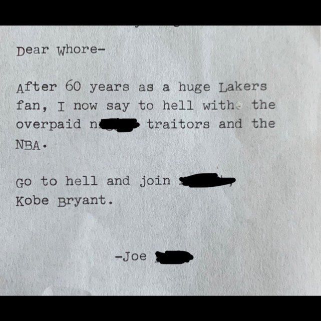 不只是湖人球员,就连湖人女老板珍妮-巴斯也未能幸免。2020年6月,珍妮-巴斯晒出了自己收到的一封死亡威胁信。信上写着:““亲爱的XX——当了60年的狂热湖人球迷后, 我现在要说,让那些薪水过高的XXX和NBA都见鬼去吧。下地狱去,和XXX科比布莱恩特作伴吧。—乔-XXX”