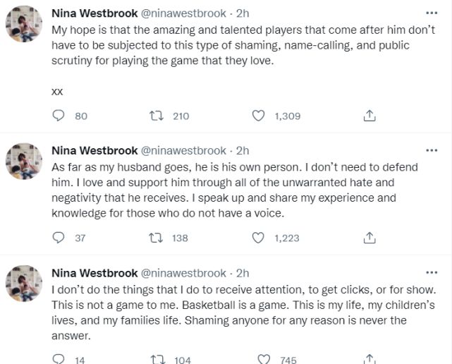 妮娜还谈到了自己的丈夫威少。“他会做自己,我不需要为他辩护,我爱他,支持他,我会陪他面对所有那些毫无理由的仇恨和消极情绪。我希望那些优秀而有天赋的球员不会因为自己喜欢的比赛而受到这种类型的羞辱和谩骂。”