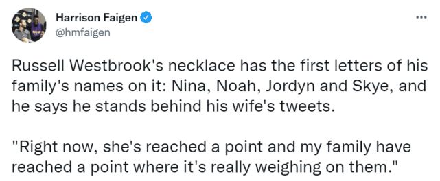 湖人记者Harrison Faigen在社媒上贴出了威少接受采访的照片。照片上威少戴着一串项链,Faigen介绍称这串项链有四个字母,分别是威少四位家人的名字首字母N,N,J,S:Nina、Noah、Jordyn和Skye。他们也是威少最在意的人。