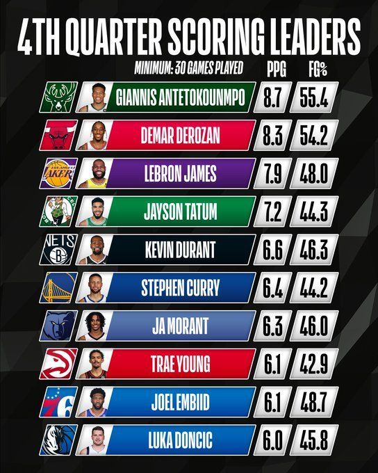 赛前官方就已经给出了末节得分+得分效率榜,字母哥末节场均8.7分,命中率55.4%,他是联盟的末节之王与末节效率之王,这场比赛末节4分钟6中5,三分1中1拿下11分,继续着他完美的表现。