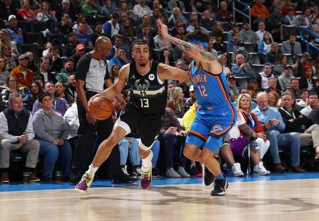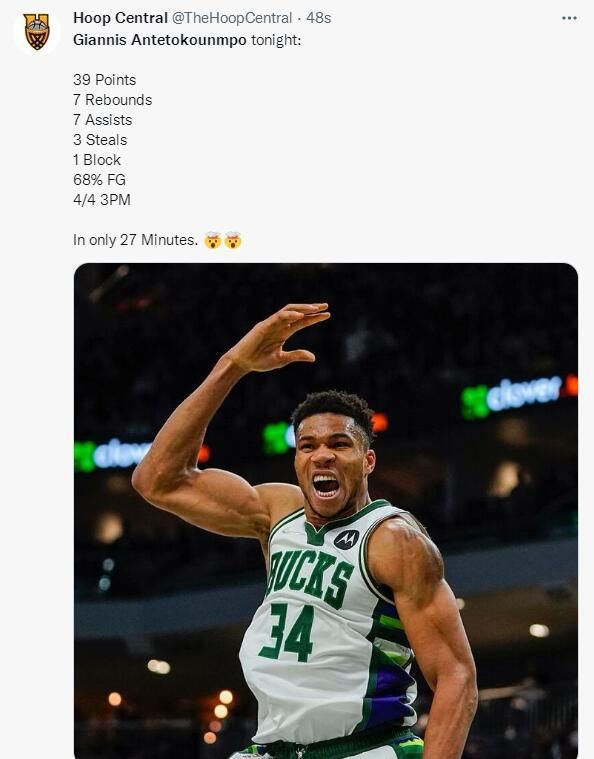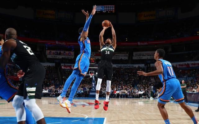 这场比赛的扬尼斯真的应该好好夸一夸,全场比赛三分球4中4,第一节一个,第二节两个,第四节一个,而过去的5场比赛他的三分球是15中2,命中率仅为13.3%,没想到面对鱼腩雷霆他的三分球投出了4中4,单场命中4个三分球平赛季最高,4个三分球+命中率100%生涯未见。