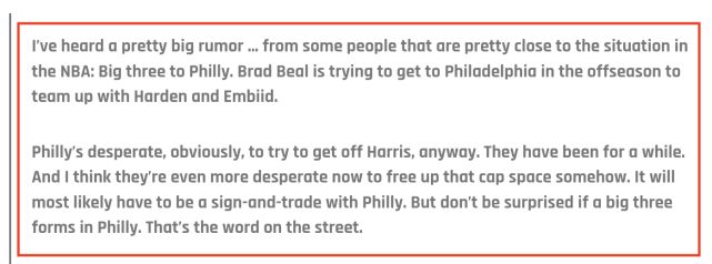 不过,布拉德利-比尔也将能在今年休赛期成为自由球员,而据前NBA中锋安德鲁-博古特的说法,比尔可能会在休赛期选择加盟76人并且联手詹姆斯-哈登和乔尔-恩比德: