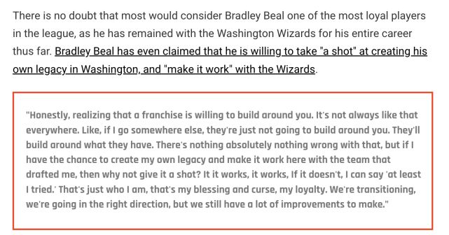 考虑到职业生涯至今都在为奇才效力,比尔确实可以说是联盟中最忠诚的球员之一,甚至在前段时间比尔还是声称自己愿意继续留在奇才: