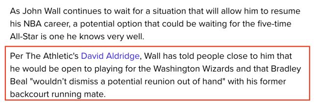 据《The Athletic》记者大卫-奥尔德里奇的说法,沃尔告诉身边人,他会愿意重返奇才,并且布拉德利-比尔“不会立即放弃与前队友重聚并且搭档的可能性。”