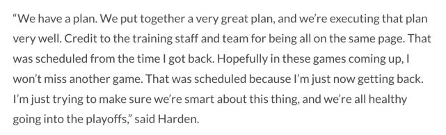 “我们有一个计划,我们制定了非常棒的计划,并且我们正在很好地执行这个计划,这从我复出时候就已经安排好了。希望在即将到来的比赛中,我不会错过另一场比赛,我想确保我们在进入季后赛时都很健康”哈登说道。