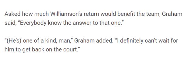 没想到如今已经到了3月份中旬,锡安还没复出,但他总算有所进展。最新消息是他可以进行负重训练,但暂时还未参加对抗训练。被问到锡安复出会给球队带来多大帮助时,格拉汉姆说:“每个人都知道这个问题的答案,他是独一无二的,我绝对等不及看他重返赛场了。”