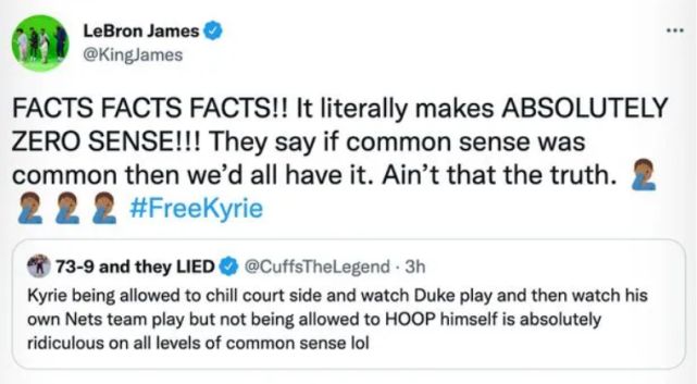 詹姆斯也在社媒上声援欧文。詹姆斯的朋友表示欧文不被允许参赛但被允许观赛完全没道理,詹姆斯转发并写道:“事实,事实,事实!毫无道理可讲!他们说如果常理很普遍,那么我们都会按照常理出牌。真理并非如此。#释放凯里。”