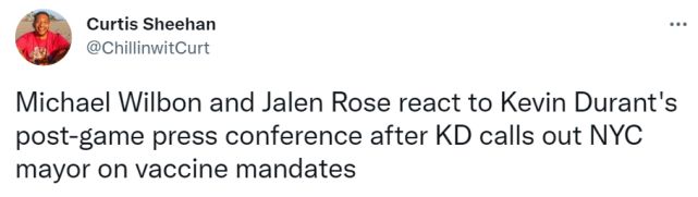 名记Michael Wilbon在节目上第一时间反驳了杜兰特。“博关注?这是什么话?你想骂的话,去骂你的队友,叫他去打疫苗,他可以没打疫苗就跑去纽约的学校里。多么不负责任,去打一针再来和我们一起打球。”
