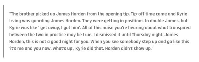 对此,ESPN记者斯蒂芬-A-史密斯就抨击哈登在场上的表现,甚至将欧文作为对比: