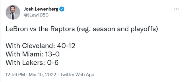 詹姆斯在这场比赛里多次发怒,可能不仅仅在于湖人又输球了,还在于他们输的是猛龙,一支曾经被詹姆斯视为手下败将的球队。猛龙记者列出了扎心的数据:詹姆斯效力骑士时打猛龙40胜12负,效力热火时打猛龙13胜0负,而效力湖人时期打猛龙是0胜6负!
