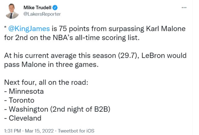 北京时间3月15日,湖人103-114不敌猛龙,詹姆斯得到30分。赛后,湖人记者报道称,詹姆斯距离超越卡尔-马龙只差75分了。詹姆斯目前场均29.7分,以这样的速度,有望在三场比赛左右完成超越。湖人接下来的4场比赛都在客场,对手依次是森林狼、猛龙、奇才和骑士。詹姆斯目前生涯总得分36854分,马龙是36928分。