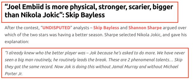 这其中著名詹黑斯基普-贝勒斯就更看好乔尔-恩比德:
