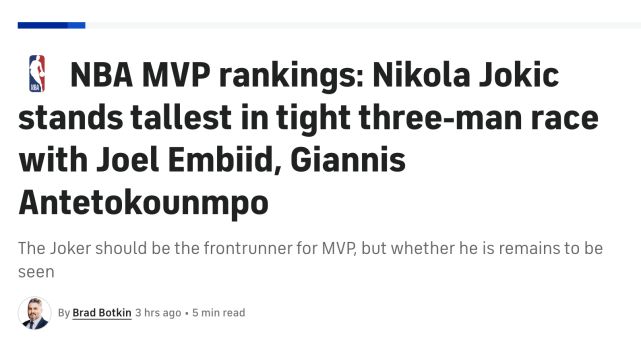 2021-22赛季常规赛MVP之间的竞争可能最终归结为3名球员,那就是乔尔-恩比德、尼古拉-约基奇和扬尼斯-阿德托昆博。