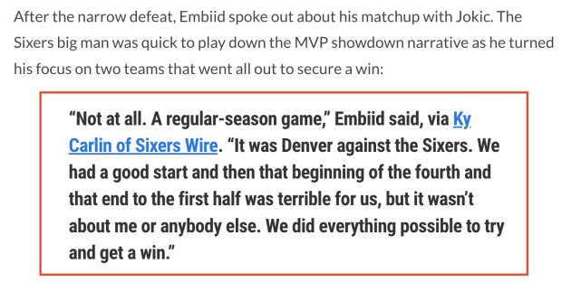 即便外界还是较为关注常规赛MVP竞争这个话题,但乔尔-恩比德对此并不那么感冒,在接受采访时,恩比德就表示自己完全将注意力放在对阵掘金的比赛上,而不是与约基奇的常规赛MVP竞争: