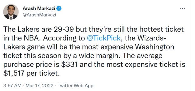 湖人虽然状态低迷,只有29胜39负,但他们依然是NBA最热门的球队之一。据记者Arash Markazi报道,20日湖人造访华盛顿,对阵奇才比赛票价为本赛季奇才主场的最高票价,本场比赛平均票价为331美元,其中最高票价为1517美元。