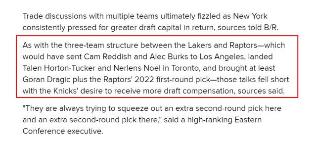 当时,这三支球队谈过这样一个交易框架:雷迪什、伯克斯去湖人,塔克、诺埃尔去猛龙,德拉季奇和猛龙的2022首轮签去尼克斯。费舍尔透露,由于尼克斯索要更多的选秀补偿,这笔交易谈判最终告吹。一位东部的高管表示:“他们总想索要一个额外的次轮签,不管什么交易都是这样。”正是这样不断索取选秀签,让尼克斯谈崩了不少交易。