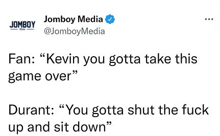 当时,某位球迷对着杜兰特大喊,“凯文,你必须去接管这场比赛。”