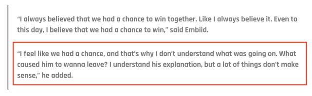 另一方面,乔尔-恩比德在德雷蒙德-格林的播客节目中谈及与本-西蒙斯的关系时表示,自己在交易之前仍相信能与本-西蒙斯在76人取得成功: