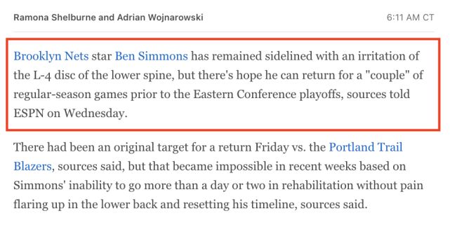目前本-西蒙斯仍无法确定为篮网出战首场比赛的时间,而据ESPN记者拉蒙娜-谢尔本和阿德里安-沃纳罗斯基的说法,本-西蒙斯目前还遭受下脊椎疼痛的伤病,至于篮网方面还是希望西蒙斯能在季后赛之前复出: