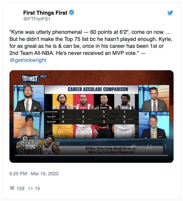 “他没有入选前75名球员,因为他打得不够多。尽管凯里-欧文很伟大,但他在职业生涯中仅有一次入选一阵或是二阵最佳阵容,他也从未得到过一次MVP选票。”
