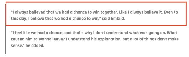 “我一直相信我们有机会一起获胜,即使是在今天,我也相信我们会有这个机会”恩比德说道,“我觉得我们会有机会,这就是为什么我至今都不明白究竟发生了什么,是什么让他想要离开?我理解他的解释,但现在很多事情都已经没有意义。”
