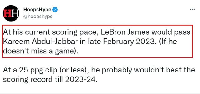 从上面的表格,我们可以看到,如果詹姆斯接下来的场次场均只有20分,他得到2023年11月10日左右超过贾巴尔,大概需要108场比赛。如果场均25分,他差不多到2023年3月26日左右超过贾巴尔,大概需要87场比赛。如果场均30分,差不多只需要72场比赛超越,大概是2023年2月24日。而最夸张的当然是场均35分,那只要62场超越,2023年1月26日完成。