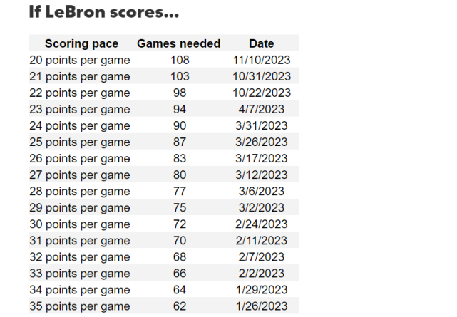 HoopsHype按照场均20分-场均35分的不同势头,为詹姆斯计算出他大概完成超越的时间,具体如下,当然,这是按詹姆斯没有缺席比赛算出来的,实际上,已经37岁的詹姆斯还是可能会缺席一些场次的。