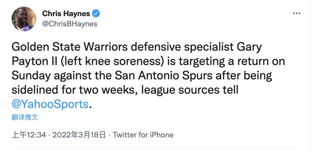 另一方面,据雅虎体育记者克里斯-海恩斯的说法,勇士后卫加里-佩顿二世计划在勇士接下来对阵马刺的比赛中复出,自从3月初以来,佩顿就因为左膝酸痛缺席勇士过去7场比赛: