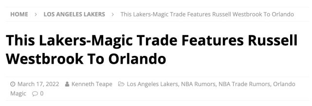 最后需要谈及的是,美媒肯尼斯-蒂佩在一篇文章中建议,湖人能在今年休赛期尝试与魔术推动涉及威少的交易: