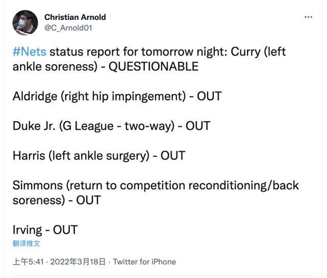 另一方面,篮网队内伤病报告已经有更新,这其中塞斯-库里进入出战成疑的名单,而阿尔德里奇、小杜克、哈里斯和本-西蒙斯等球员继续缺席比赛,同时由于篮网下一场是主场迎战开拓者的比赛,拒绝接种疫苗的欧文仍无法出战: