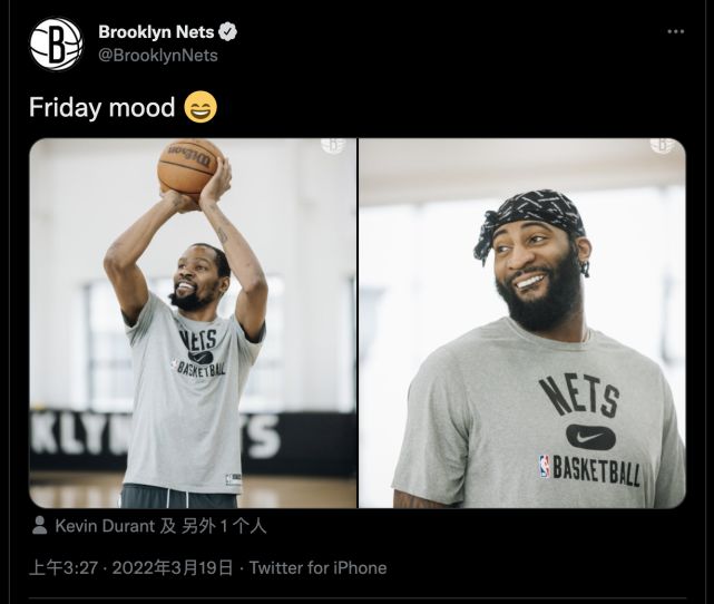 最后需要谈及的是,篮网官方推特晒出凯文-杜兰特和安德烈-德拉蒙德的训练照: