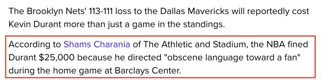 在篮网不敌独行侠的比赛中,杜兰特和场边球迷的“互动”引起热议,而且不出所料,杜兰特最终还是收到联盟的罚单。