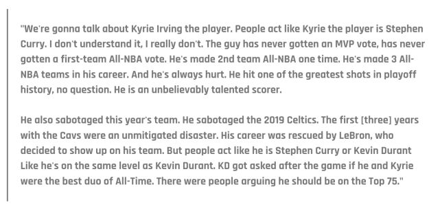 另一方面,联盟中关于凯里-欧文的批评并没有结束,名记蒂姆-邦坦普斯就在一档节目中抨击欧文够资格入选75大球星的言论: