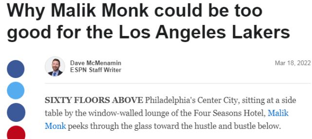 除此之外,湖人还有一个另外的利好因素,即本赛季年薪只有180万美金的蒙克,他目前场均12.8分创造生涯新高。蒙克成为詹姆斯的新带刀护卫,而他与哥哥一起接受湖人记者Dave McMenamin采访时,通过哥哥之口表达了愿意续约留队的意愿。