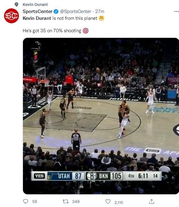 美媒SC还在杜兰特命中那个三分球后写道:杜兰特以70%的命中率拿下了35分,他不是来自这个星球的球员。