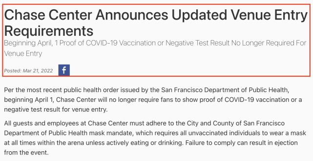 据勇士官方宣布,球队主场大通中心的入场要求已经有所更新。在这份公告中,大通中心从4月1日开始将不再要求入场球迷出示接种疫苗证明或是核酸阴性检测结果: