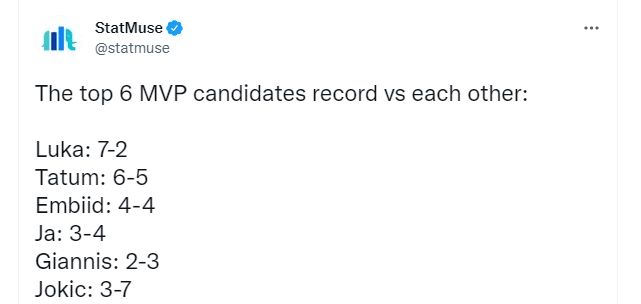 此外,StatMuse还公布了NBA官方MVP榜前6位的球员互相交锋的战绩,分别是东契奇、塔图姆、恩比德、莫兰特、字母哥、约基奇。从这个角度来看, 东契奇打MVP竞争对手的球队战绩是最好的。