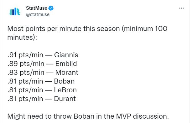 北京时间3月23日,数据网站StatMuse晒出了本赛季至今球员每分钟的平均得分排名,结果显示,字母哥力压恩比德排名第一,詹姆斯和杜兰特、博班并列第四。