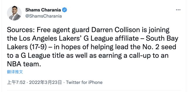 达伦-科里森看来还没有完全放弃重返NBA赛场的机会。据美媒沙姆斯-查拉尼亚的说法,科里森已经与湖人发展联盟下属球队南湾湖人队签约,这也意味着科里森还是希望能得到重返联盟的机会: