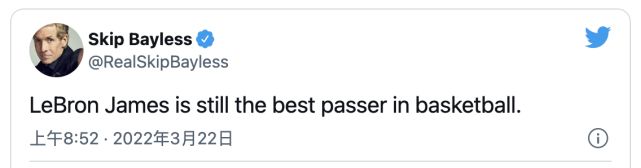 另一方面,著名詹黑斯基普-贝勒斯在詹姆斯对阵骑士比赛中得到38分11篮板和12助攻数据表现之后表达称赞:
